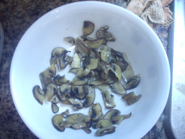- Sauté mushrooms, then cut up into smaller pieces. Chop up garlic.
